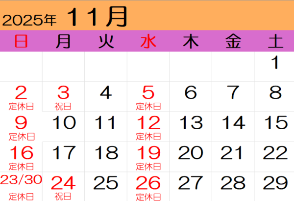 11月3日(月)・24日(月)・・・祝日のため定休日