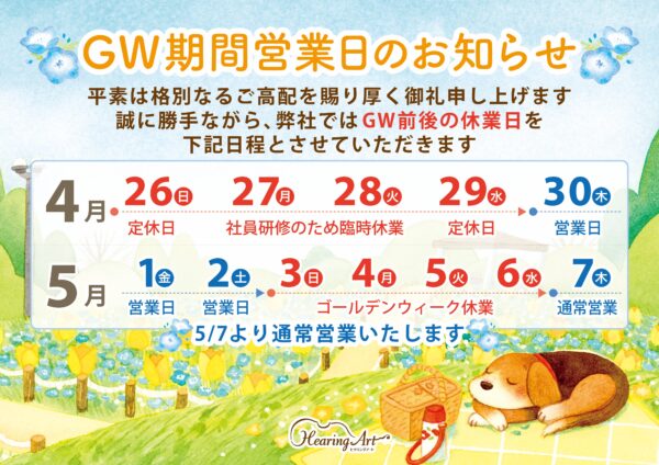 ゴールデンウィーク期間の営業日は下記の通りです。