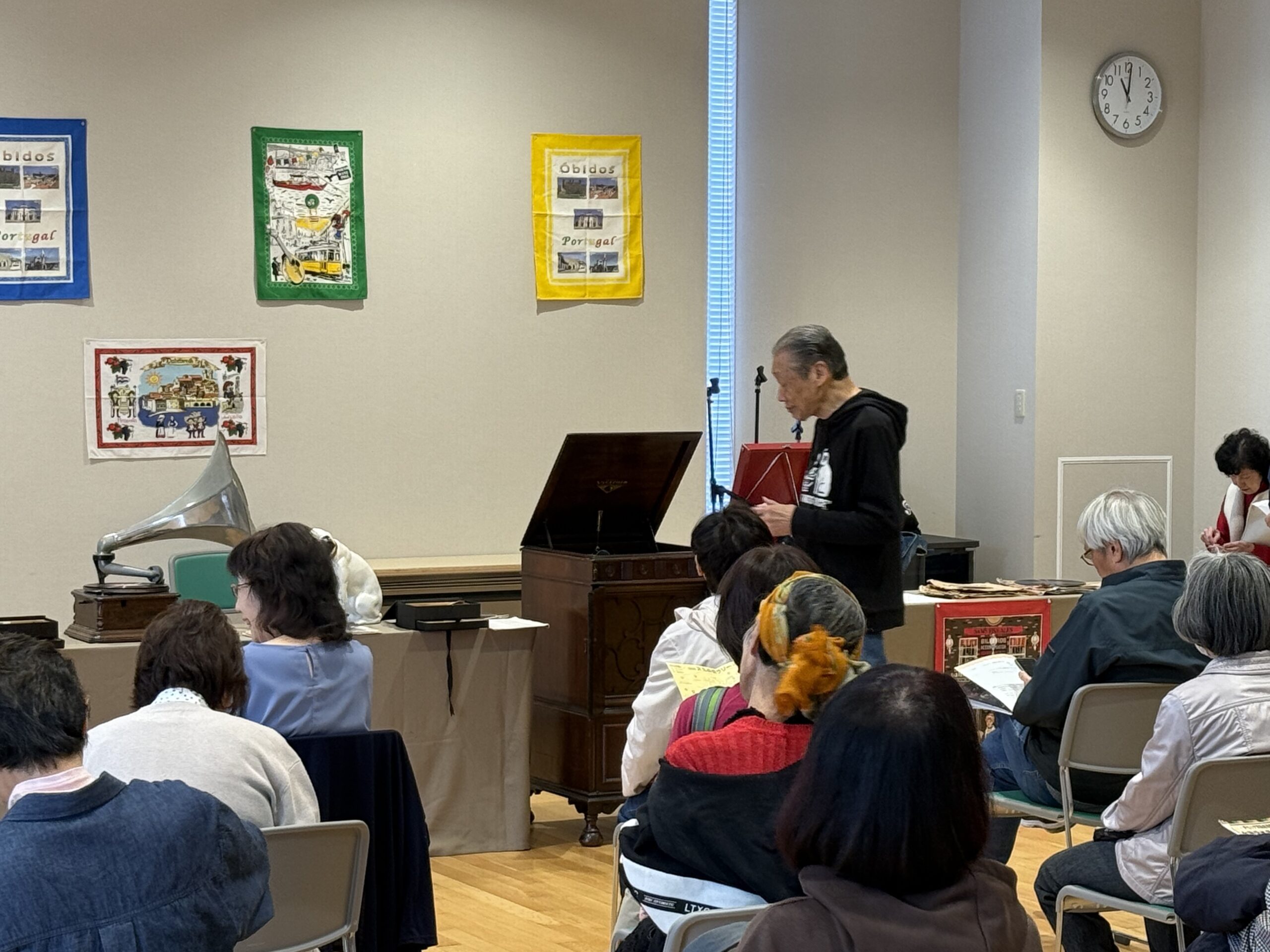 作品をじっくり見学して②中央公民館で手回し蓄音機鑑賞会に参加しました。