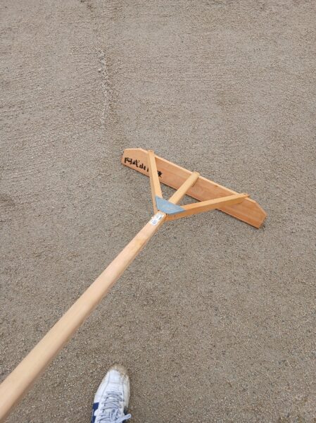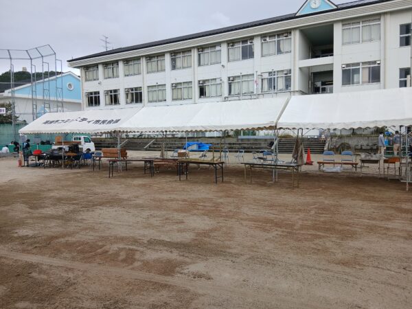 雨がしとしと降る中、午後の晴れ間と子どもたちの笑顔を願いながら、テントの組み立てやグラウンド整備を進めました