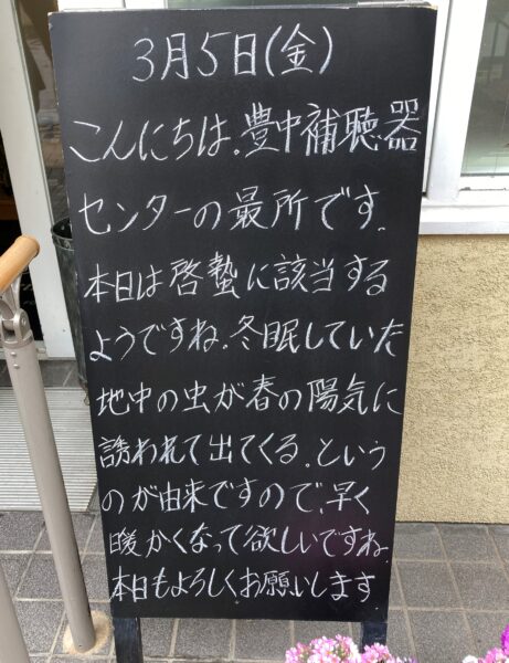 3月の豊中モーニング 豊中店 2021年3月5日 こんにちは!豊中補聴器センターの最所です。 3月に入って、徐々に暖かくなってきましたね! 花粉は気になりますが、店内から桃色の花が見えておりまして、とても綺麗ですよ! こちらは「啓蟄(けいちつ)」と読みます。 「啓」はひらく事で 「蟄」は虫が土の中に閉じこもる事なんだとか 私も最近は、目覚めて布団に包まる事も少なくなってきました。 本格的な春は目の前ですね。今の内に聴こえの準備をいたしましょう! ご来店お待ちしております。