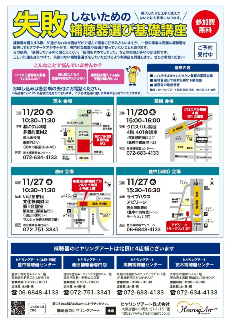 「補聴器選びの基礎講座」4会場で開講いたします!