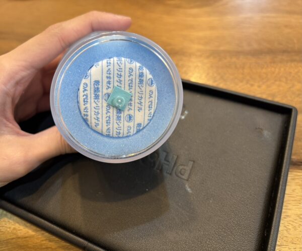 乾燥剤中央の部分が最初は下の写真のような鮮やかな水色なのですが、乾燥の効力がなくなってくると