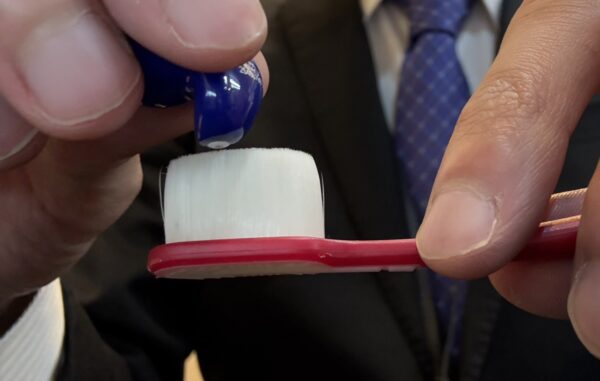 補聴器の先端のフィルター部分に詰まった耳垢を、歯ブラシで優しく撫でるように取り除きます。