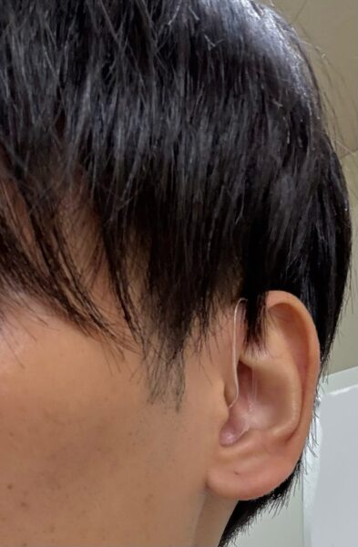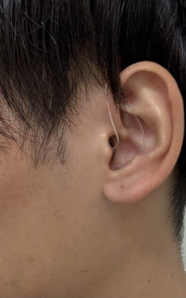本体が大きい分目立つのではないかと心配されるお客様もいらっしゃいますが、実際は耳の後ろに補聴器本体が隠れるため、正面や横から見ても見える部分は透明のチューブだけですので目立ちにくいようになっています。